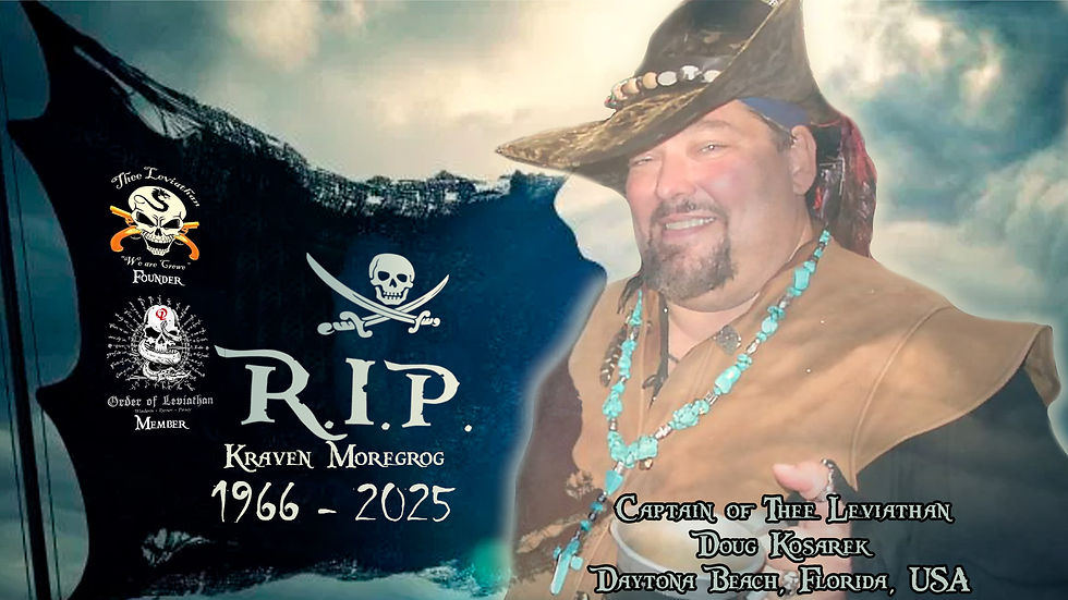 The International Pirate Community wishes to formally recognize and honor the legacy of Captain Kraven Moregrog Douglas Kosarek a respected leader and influential figure in the coulture of pirate entertainment. Doug Kosarek was more than a pirate or crew leader. He was a builder of community, a guardian of pirate values, and a driving force behind one of the most significant pirate crews in the United States. Through his leadership, dedication, and presence, he helped shape the modern pirate movement in America with Thee Leviathan.